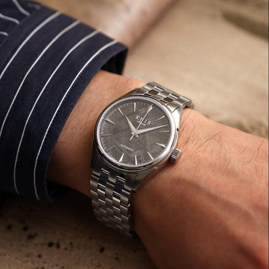 KNIS Meteorite Dial Watch宇宙から飛来したメテオライト(隕石)を文字盤に用いた日本製腕時計。メテオライトの特徴である美しい神秘的な網目状の模様( ウィドマンシュテッテン構造)は特殊な状況下(宇宙)において、約100万年以上を要するため、地球上では再現できないと化学的に解明されています。神秘的な模様を浮かび上がらせるメテオライトは、100万年の時が刻まれた美を放ちます。その美しさは、まるで小宇宙が手元にあるかのような魅力溢れる至高の一品です。