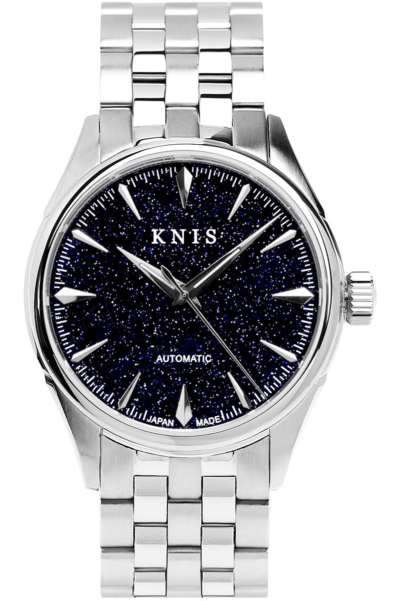 KNIS Aventurine Dial Watch星空のような輝きのアベンチュリンガラスを文字盤に用いた日本製腕時計。アベンチュリンガラスは18世紀のベネチアに起源をもつとされる人造石の一種で、ガラス質の素材のなかに酸化銅の極小の結晶を内包することで、夜空に輝く星を思わせる神秘的な輝きを放つ。