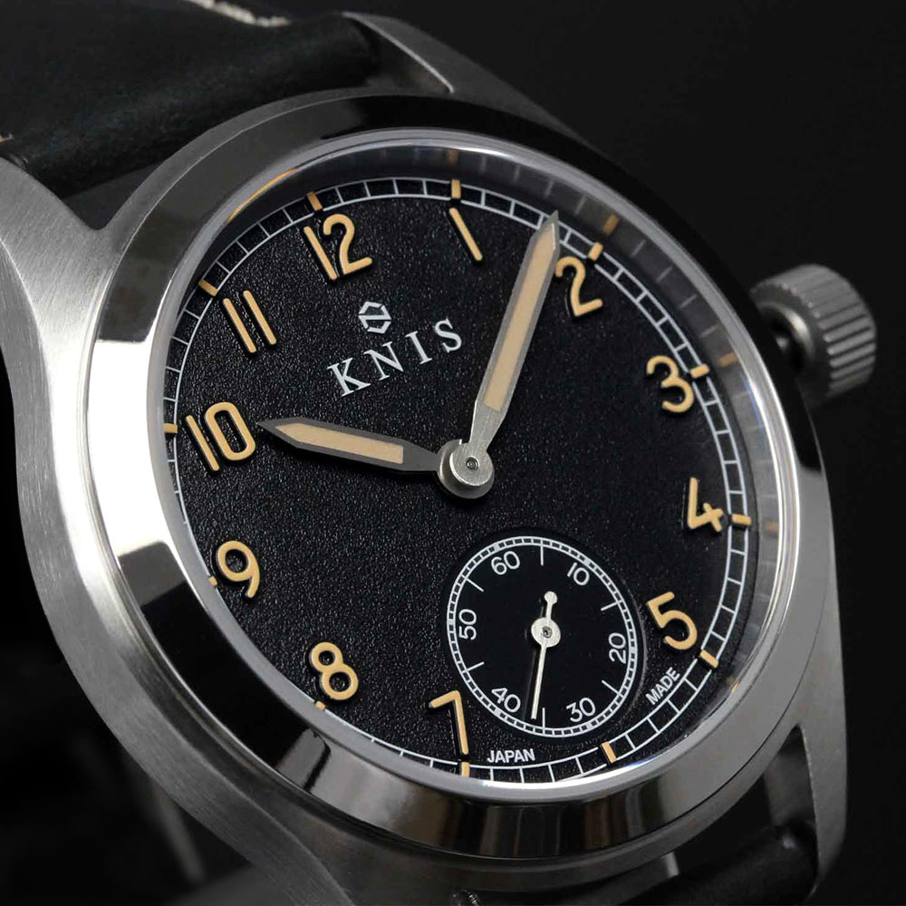 海外ブランドのミリタリーウォッチは40mm以上のケースサイズが一般的ですが、KNISでは日本人の腕に合うサイズ感にこだわり、直径38mmのケースにしました。細い腕にも違和感なくフィットし、ミリタリーデザインながらも上品な雰囲気を持っています。