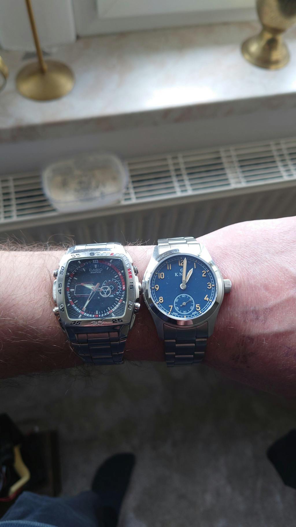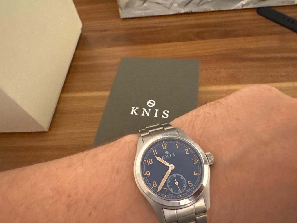 海外ブランドのミリタリーウォッチは40mm以上のケースサイズが一般的ですが、KNISでは日本人の腕に合うサイズ感にこだわり、直径38mmのケースにしました。細い腕にも違和感なくフィットし、ミリタリーデザインながらも上品な雰囲気を持っています。